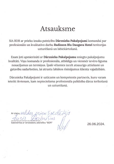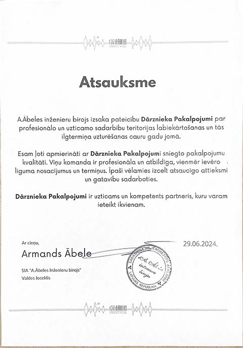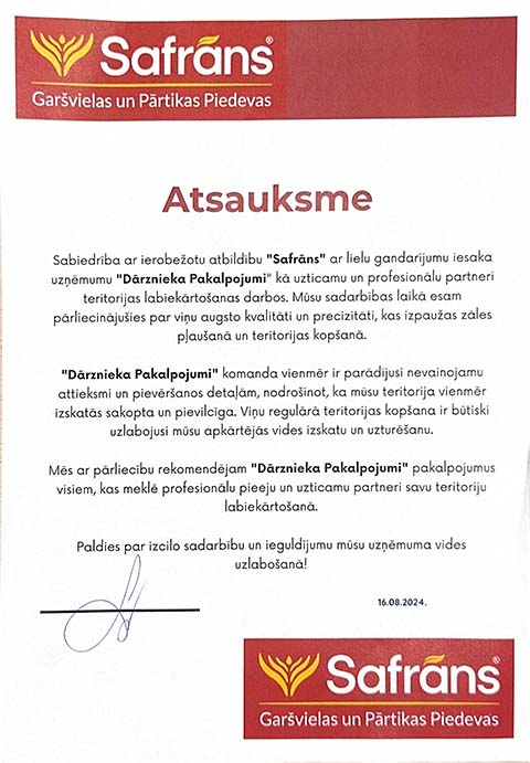 Larisa Savkunenko2024-06-17Grību pateikties par profesionalo dārznieka pakalpojuma sniegšanu. Sevišķi atzīmēšu arborista darbu sausa koka nozāģēšana. Pēc darba pabeigšanas teritorija tika sakopta perfekti. Ļoti patīkami strādat ar tādiem profesionāliem. Paldies.